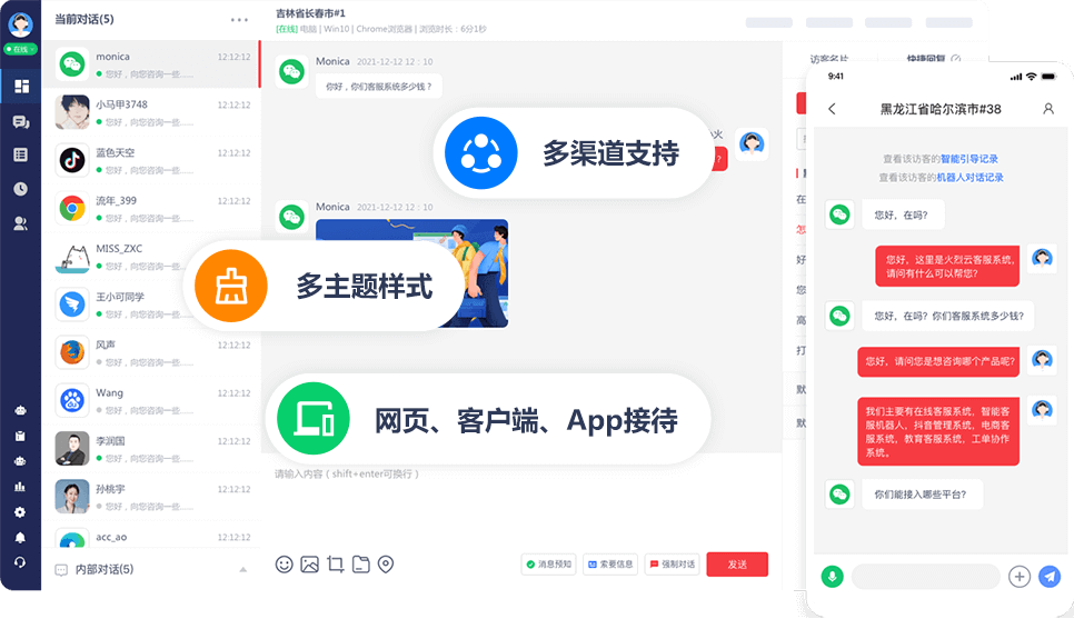 整合CRM、全景统计、工单系统等模块。支持多主题样式,轻集成API等 高效获客转化神器,快速上手,一键集成
