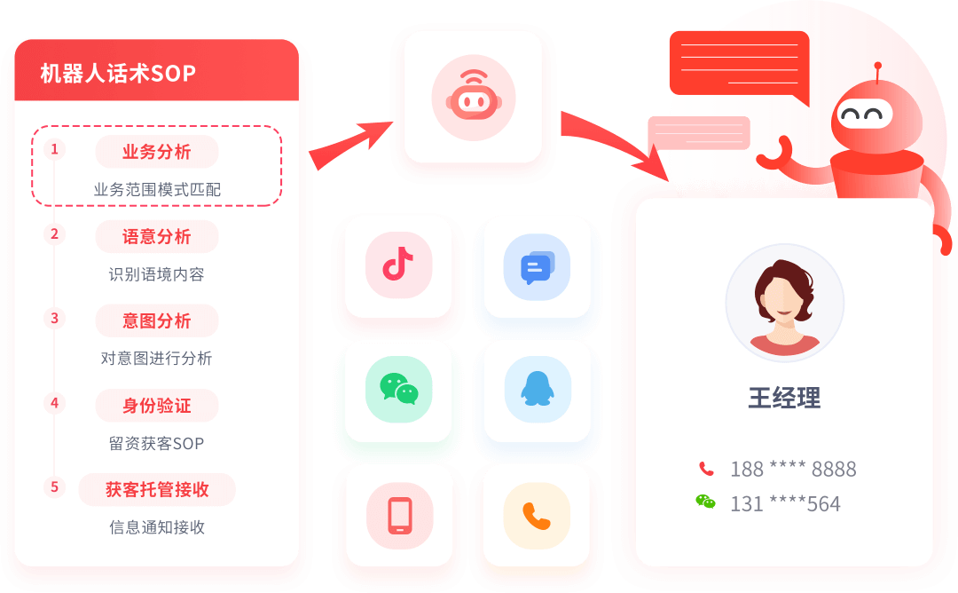 智能学习业务场景,自动创建对话知识,精准分析客户意图 全天值班,模拟真人,全场景接待,让获客更轻松