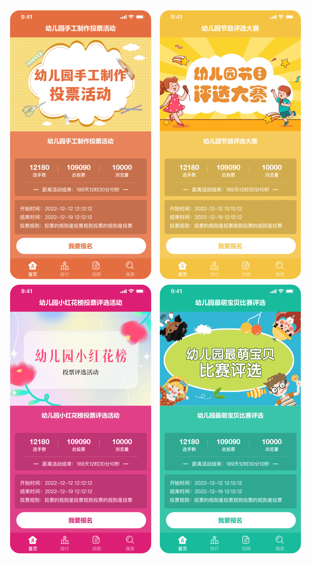 上面四个包括幼儿园节目评选大赛,幼儿园最萌宝贝比赛评选,幼儿园小红花榜评比,幼儿园手工制作投票活动,也可以制作舞蹈、歌唱等相关投票主题。投票管家内包含上百套通用模板,能适合大部分幼儿园评选投票场景。您也可以联系客服帮您制作好看的封面图片。