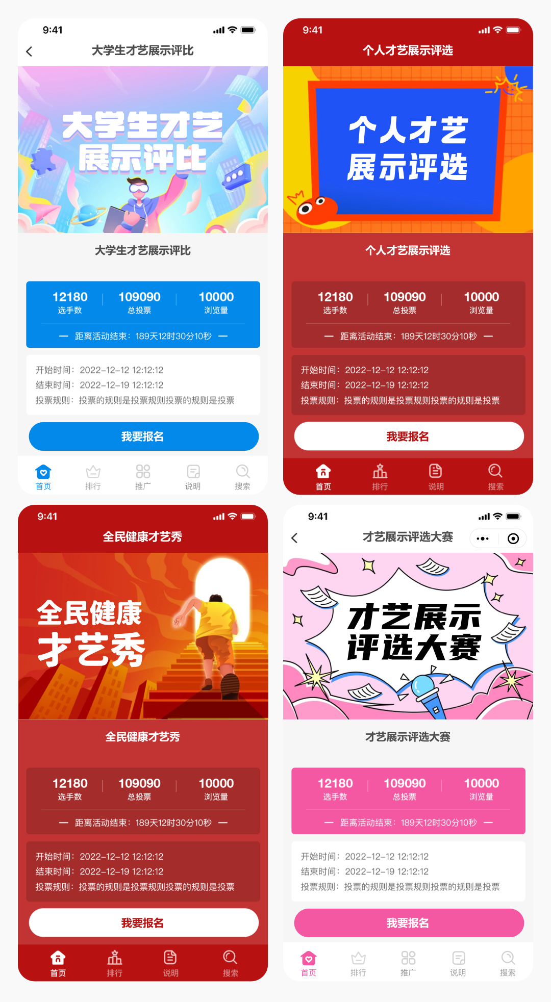 以上4套主题包括:1.大学生才艺展示评比,2.个人才艺展示评选,3.全民健康才艺秀,4.才艺展示评选大赛,等才艺相关主题投票模板。