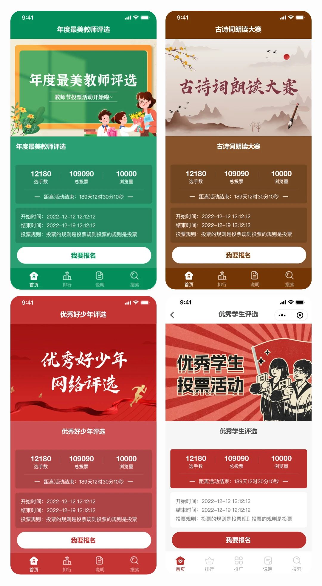 上面四个包括古诗词朗读大赛,手工品评选,优秀好少年评选,优秀学生评选,投票管家内包含上百套通用模板,能适合大部分小学评选投票场景。您也可以联系客服帮您制作好看的封面图片。
