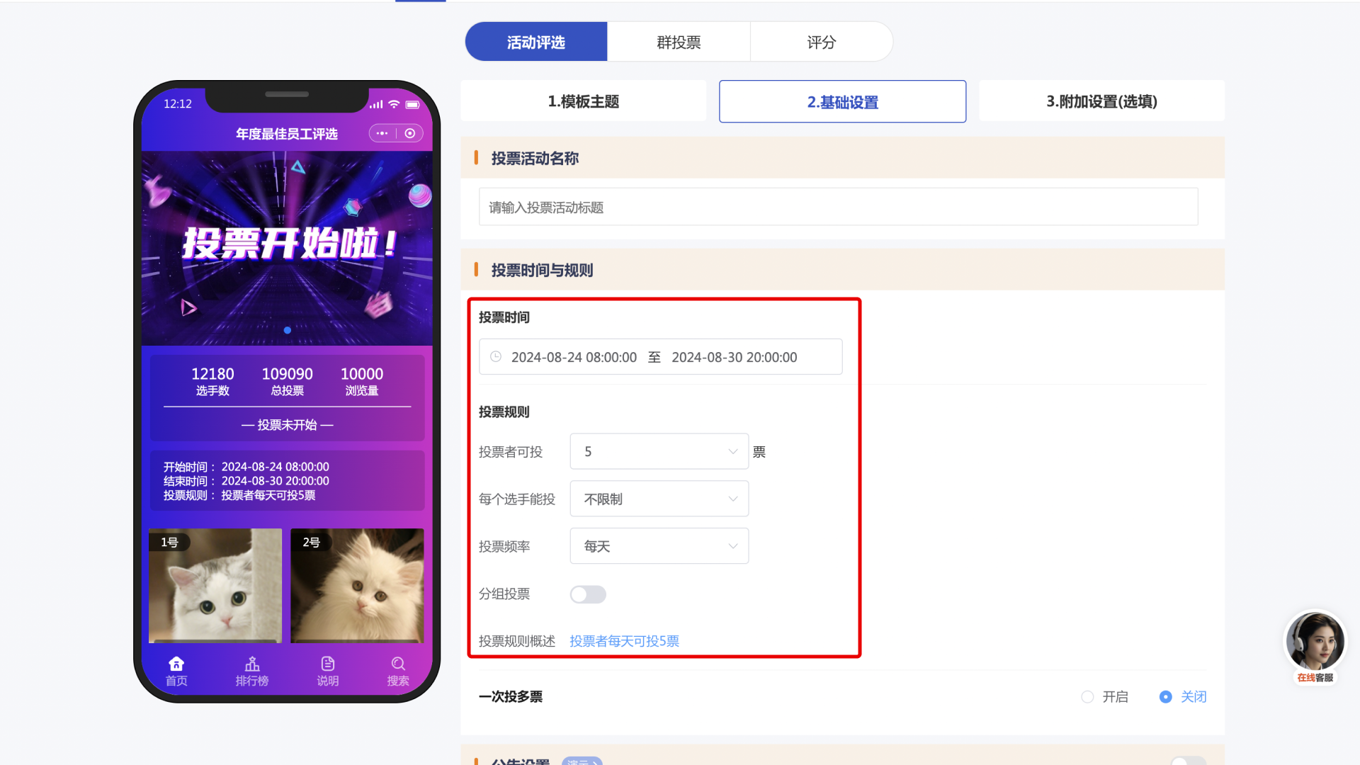 编辑活动基础信息,设置活动名称;精准设置投票起止时间,精确到具体日期与时刻;设置活动介绍,阐述投票背景、目的、规则等关键信息。