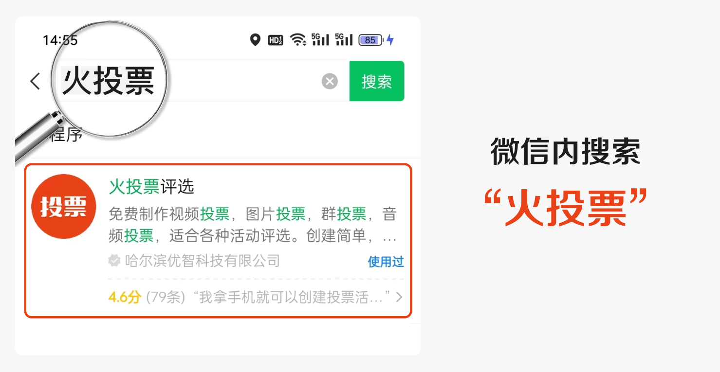 1、在微信中 搜索 小程序 火投票