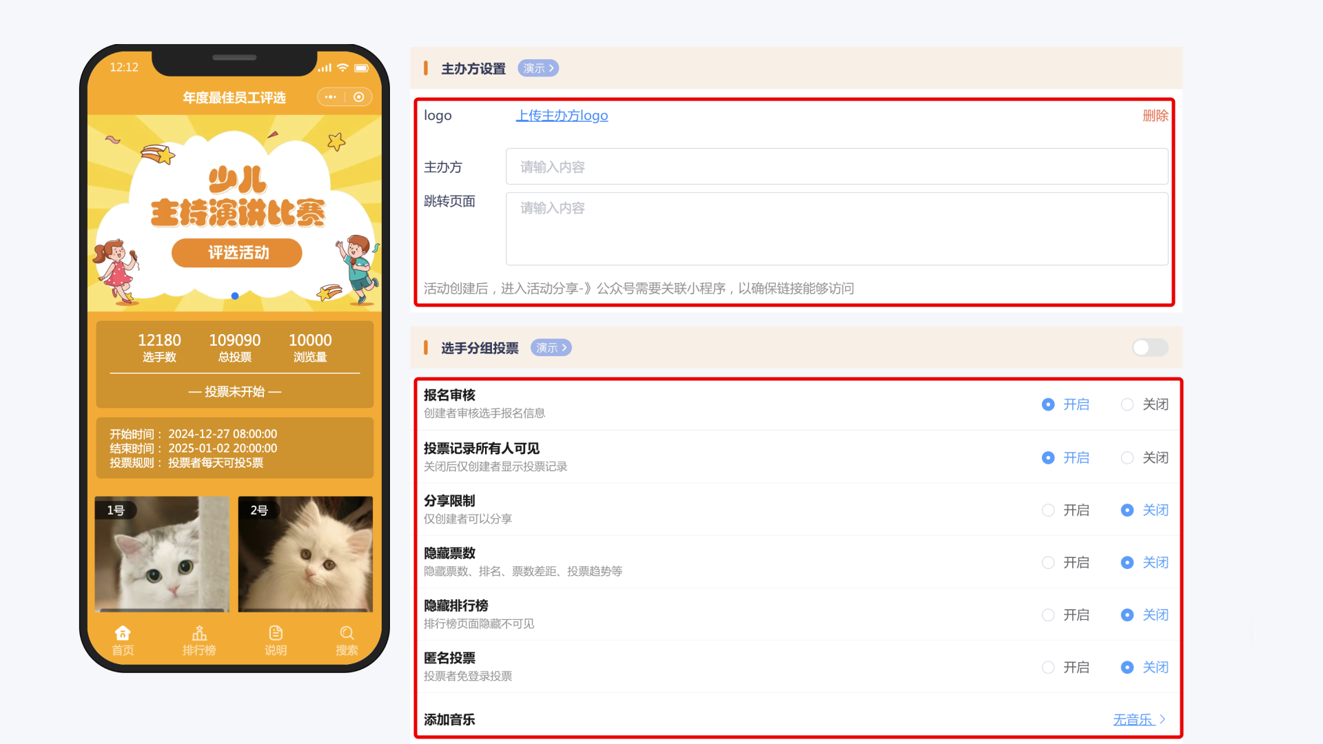 主办方与分组:可以明确主办方,上传主办方logo。同时,根据实际需要,将参赛选手进行合理分组,便于投票。