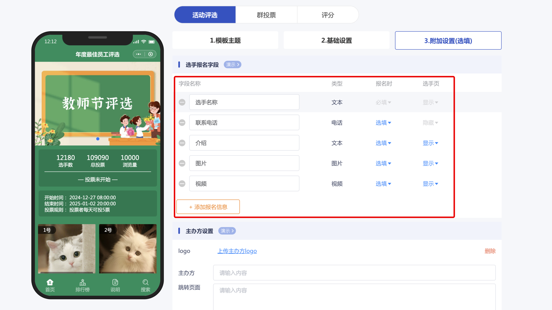主办方与分组:明确标注主办方信息,上传主办方logo。同时,根据实际需求,将参赛选手进行合理分组,便于投票管理。