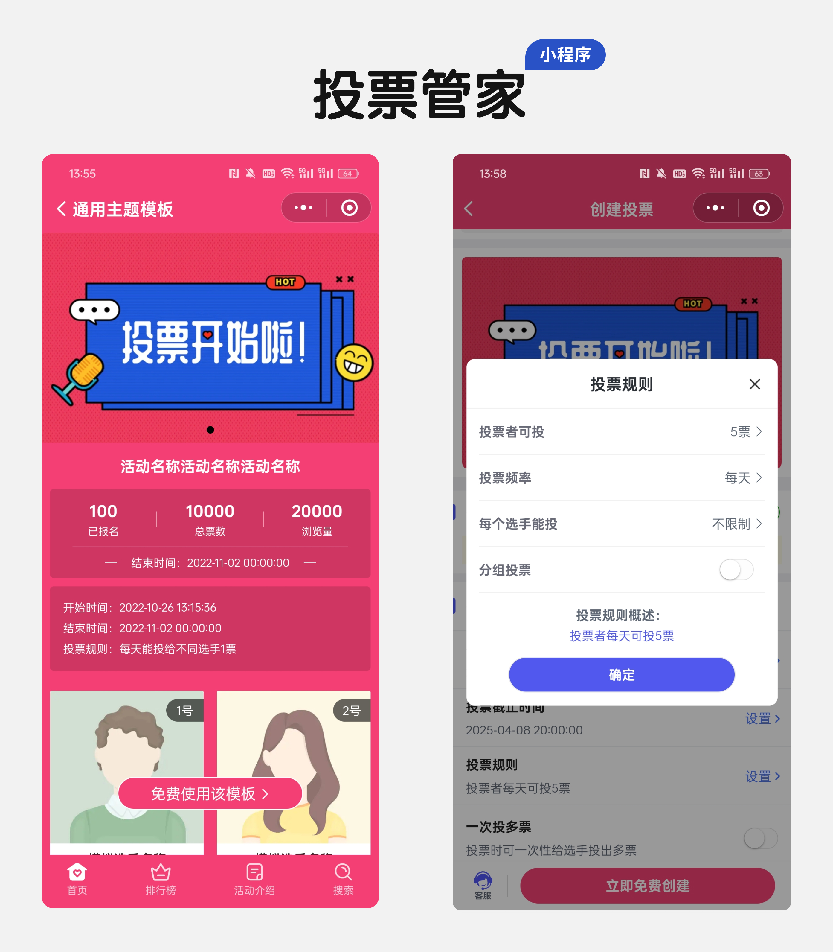 有许多免费的投票平台可供选择,以下是一些常见且操作简单的平台:火投票、投票加加、投票管家。直接进入投票管家小程序中。
