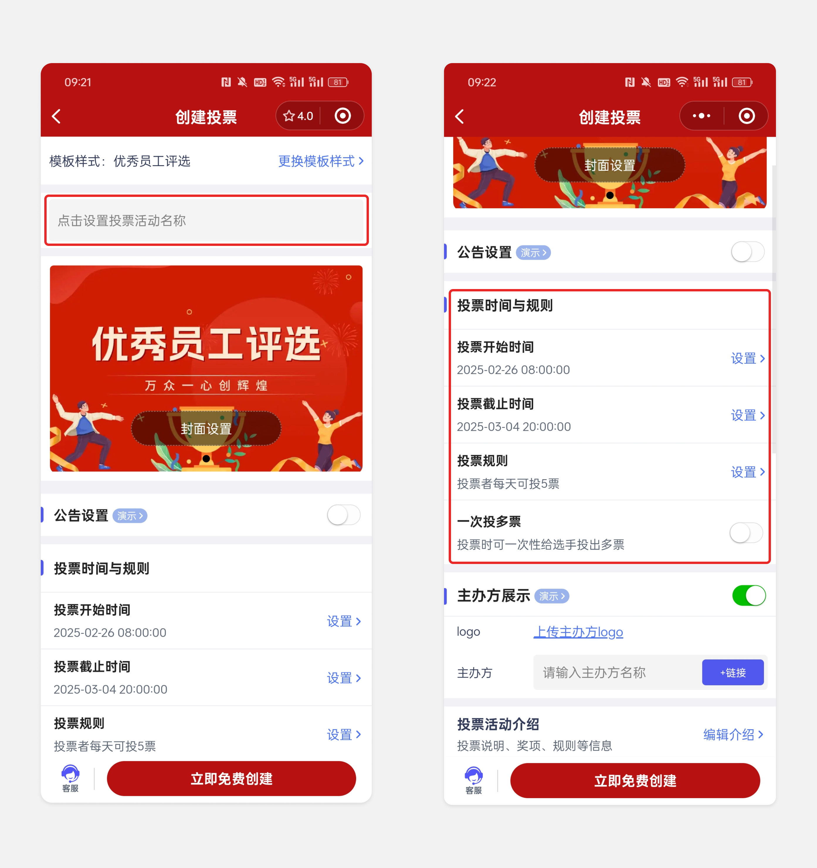 打开火投票小程序,选择“员工评选”模板。先给活动起个实在的标题。最重要的是明确评选维度,避免笼统的“表现优秀”:可以从“业绩达成”“协作支持”“问题解决”“创新改进”四个维度入手,每个维度简单说明标准,让投票者有具体参考,而非凭印象投票。