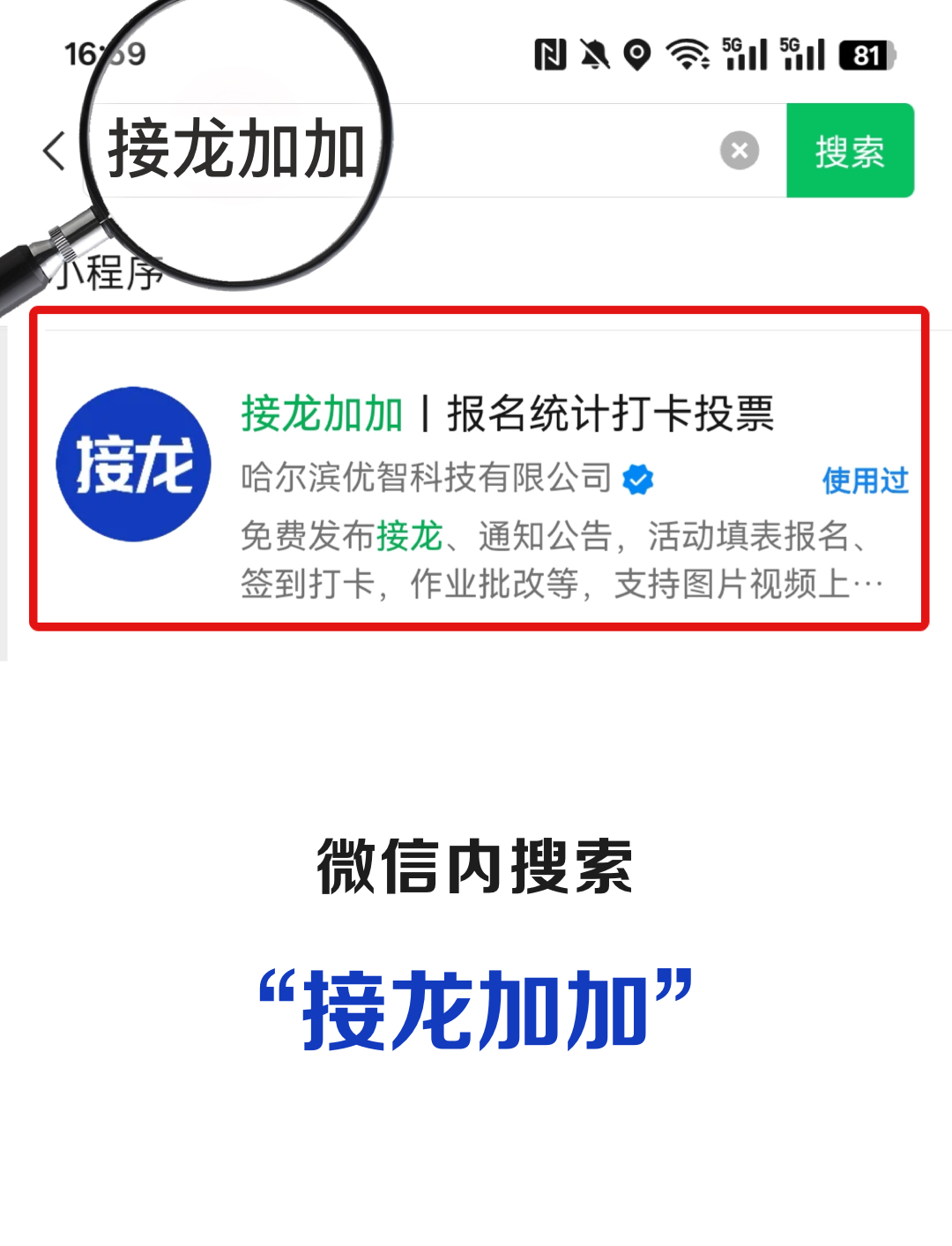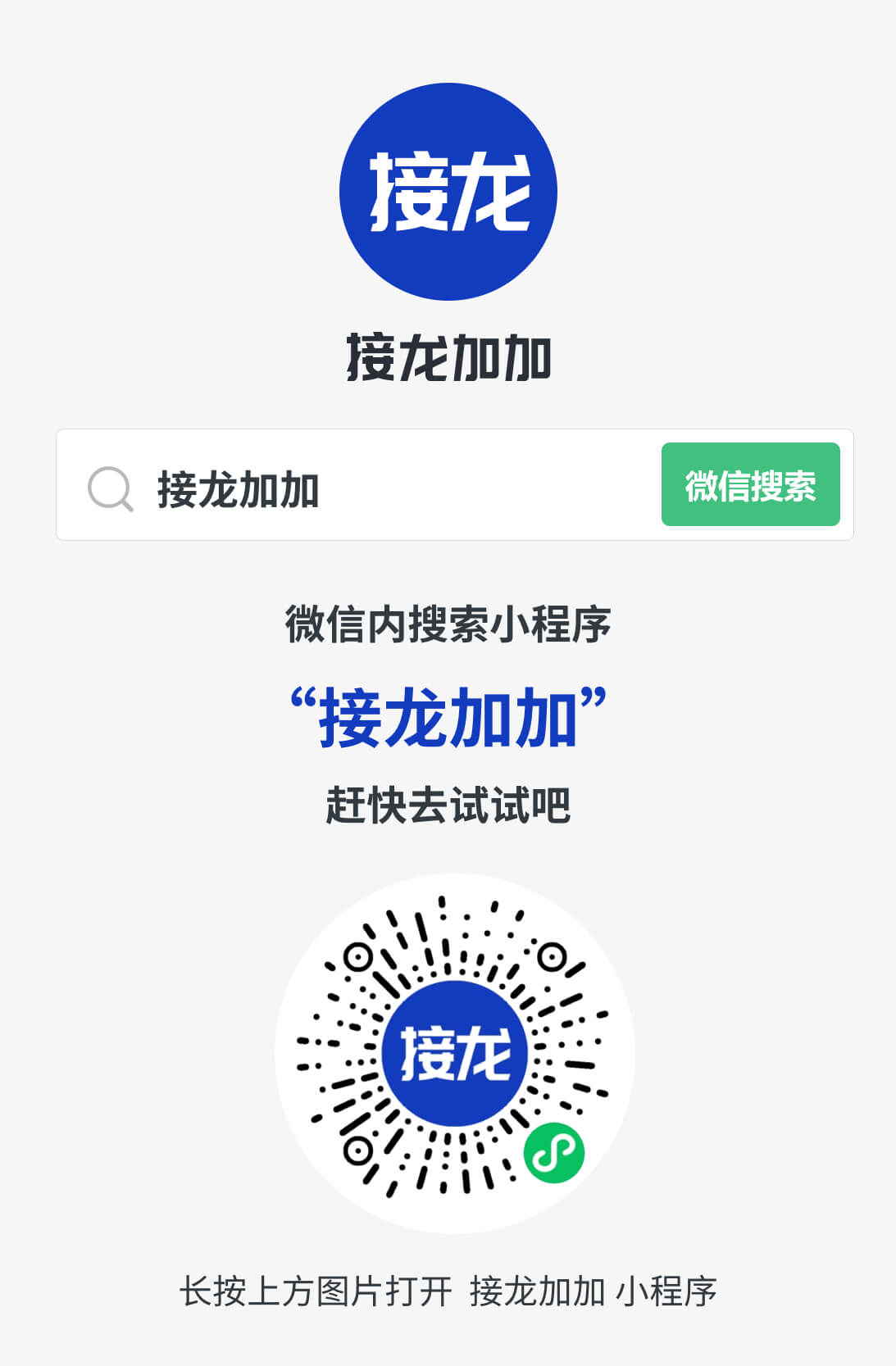 打开微信,在顶部搜索栏输入接龙加加,点击搜索结果中带有官方标识的接龙加加小程序(无需下载安装,微信内直接打开)。进入小程序首页后,点击右上角“微信一键登录”(确保后续报名数据能稳定保存,避免丢失)。