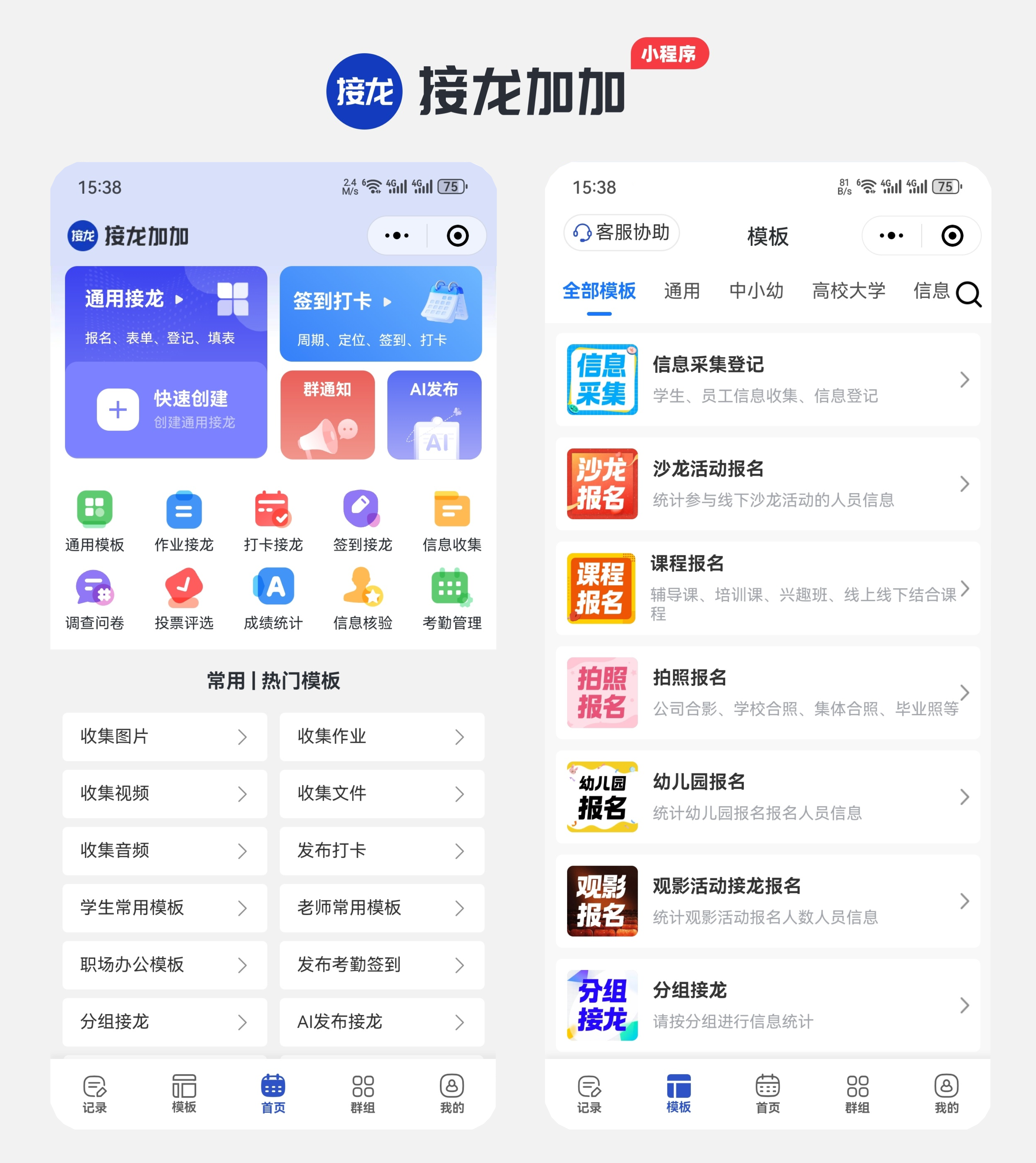 在首页下方的分类栏中,找到并点击【模板】板块,这里专门整合了适合不同场景的报名模板,根据具体报名需求选择对应模板,每个模板都预设了学校场景必备的字段,不用手动添加基础内容。若现有模板不匹配特殊需求,可选择创建【通用接龙】,后续手动添加需要的字段。