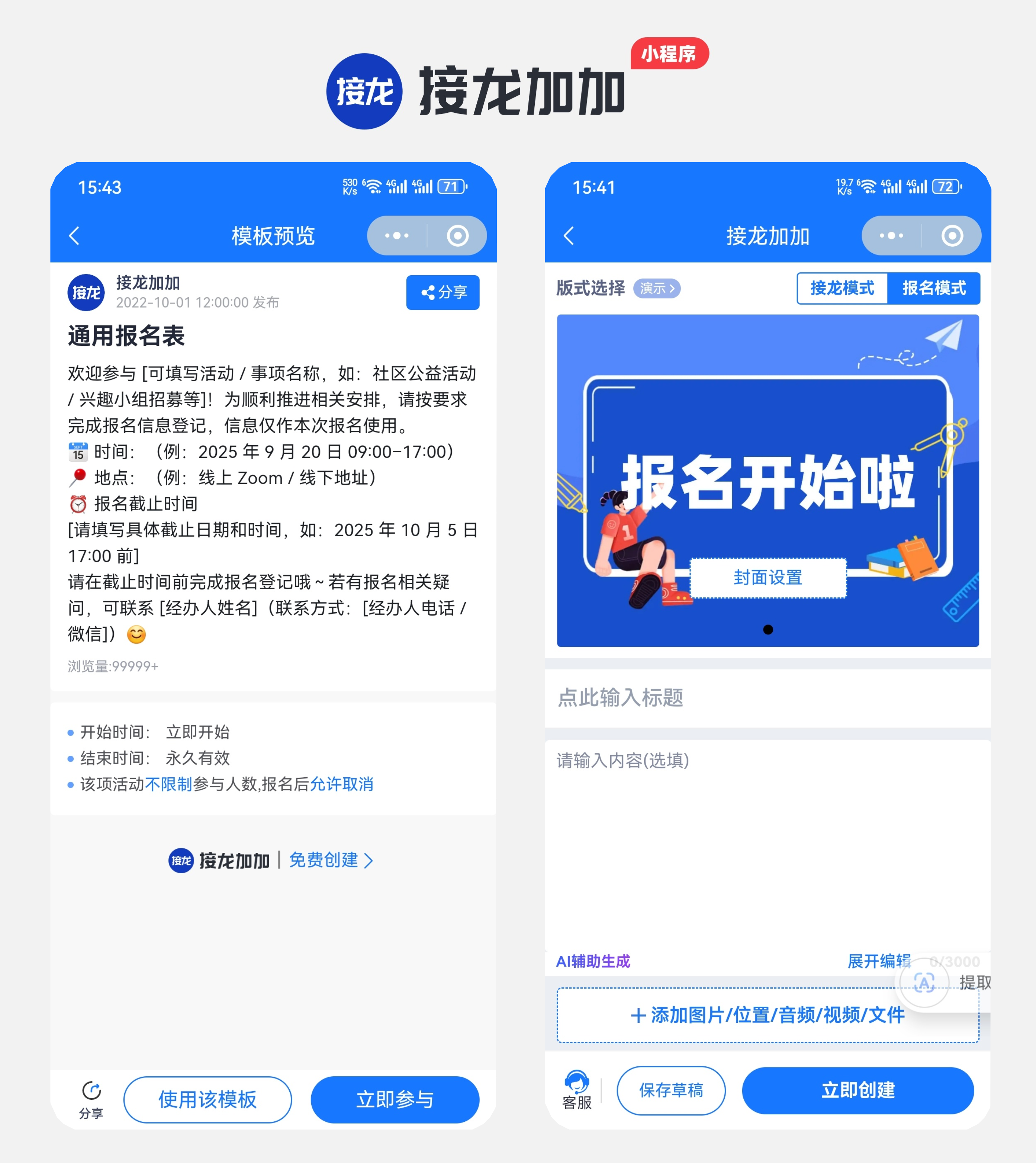 打开微信搜接龙加加进入小程序,首页点击【新建接龙】,从提供的模板中直接选择学生线上订餐模板,模板自带“学生姓名、班级、餐品选择、份数、过敏提示、配送时段”等预设字段,不用自己一个个加,直接适配学校订餐需求。