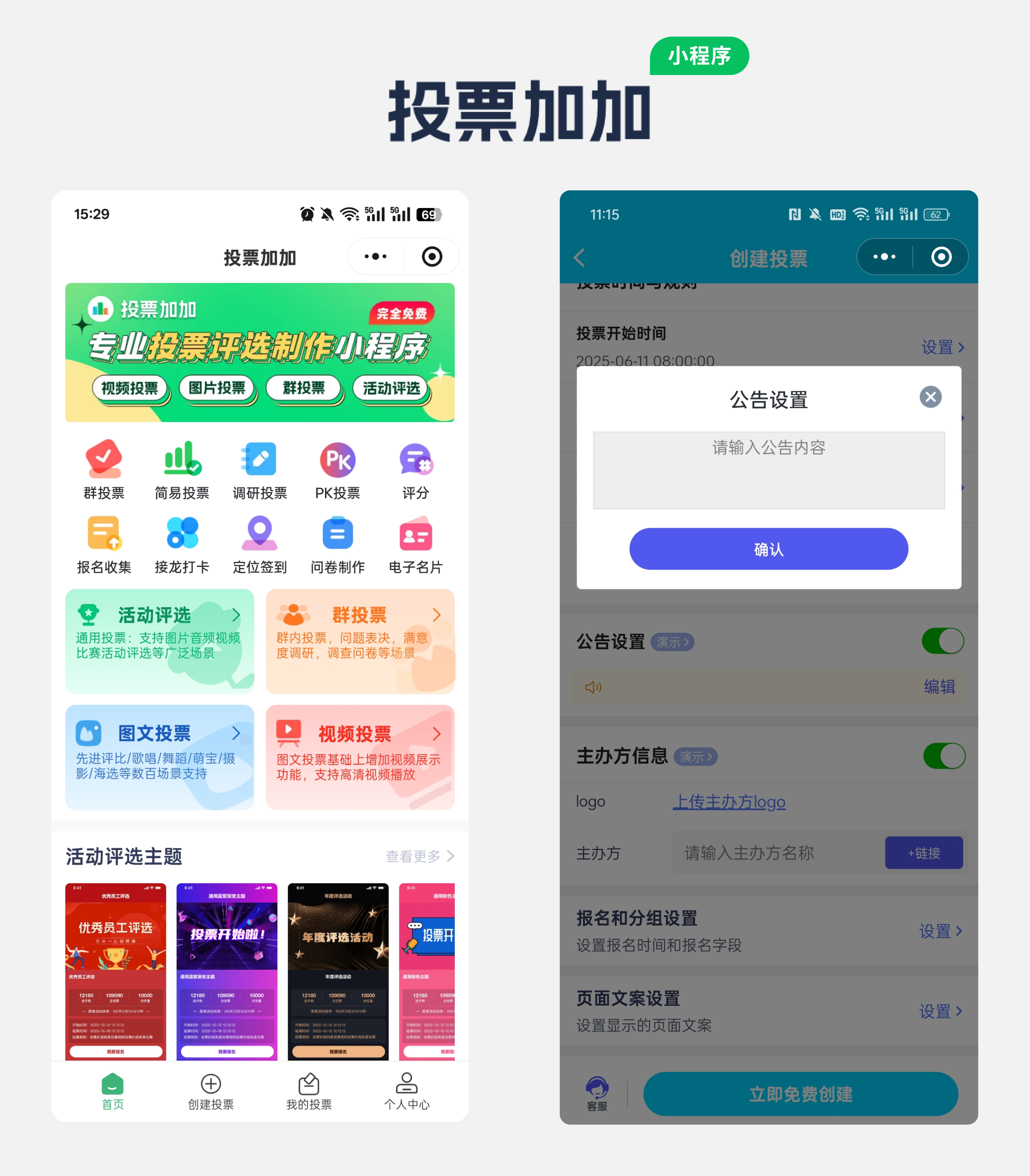 打开微信搜索“投票加加”,选择投票类型(图文、视频、评分等),填写选项,点击发布——整个过程像发朋友圈一样简单,完全不需要学习成本。