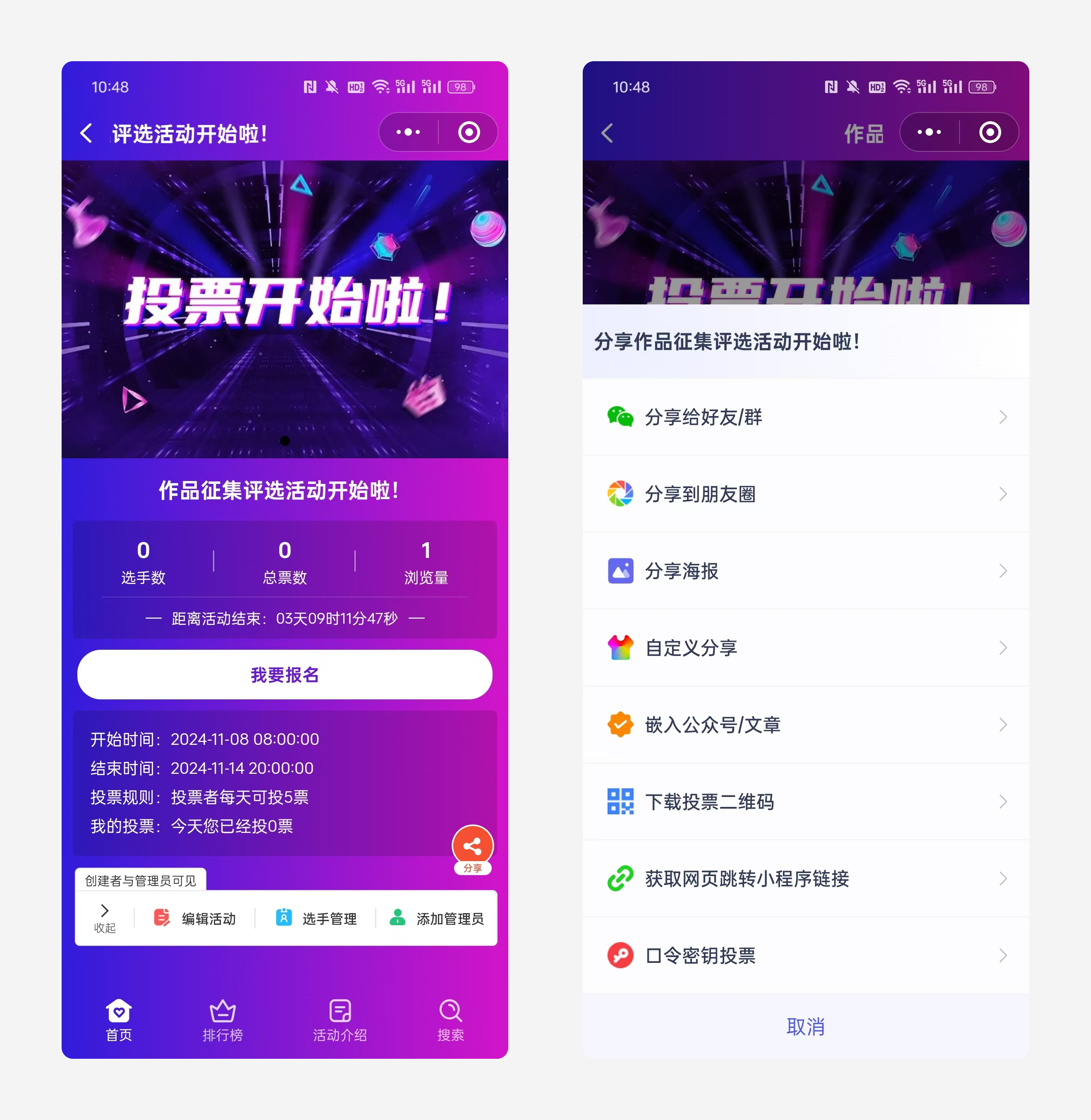 上传作品:支持参赛者自行上传作品,或由发起者统一上传(适合小型活动);