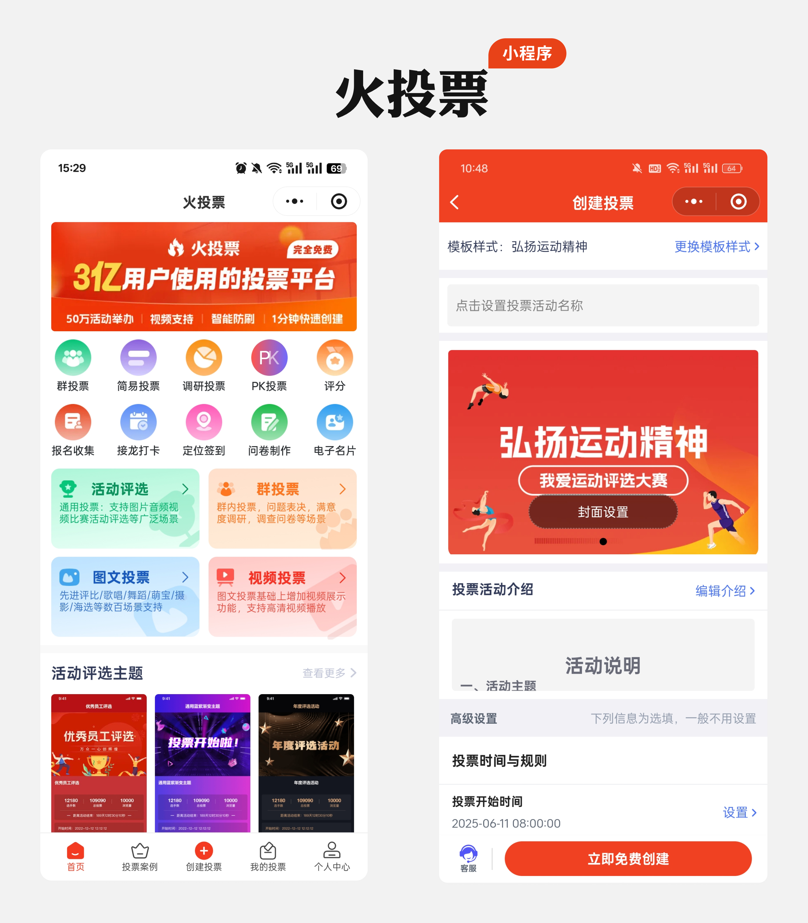 进入首页后,点击底部显眼的“创建投票”按钮,进入模板库。这里有三类模板任你选: