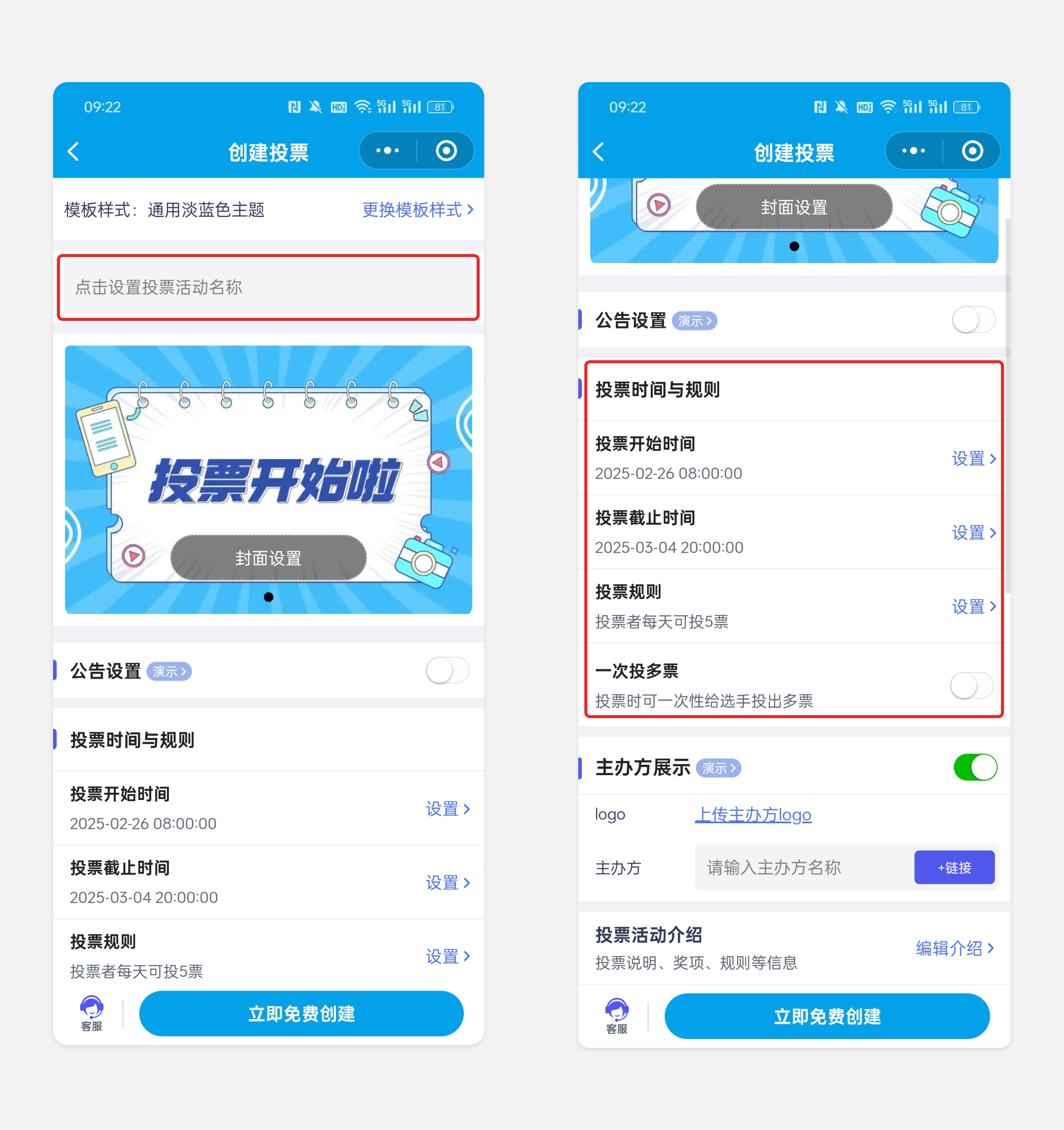 时间设置:精确到分钟,到期自动关闭投票;