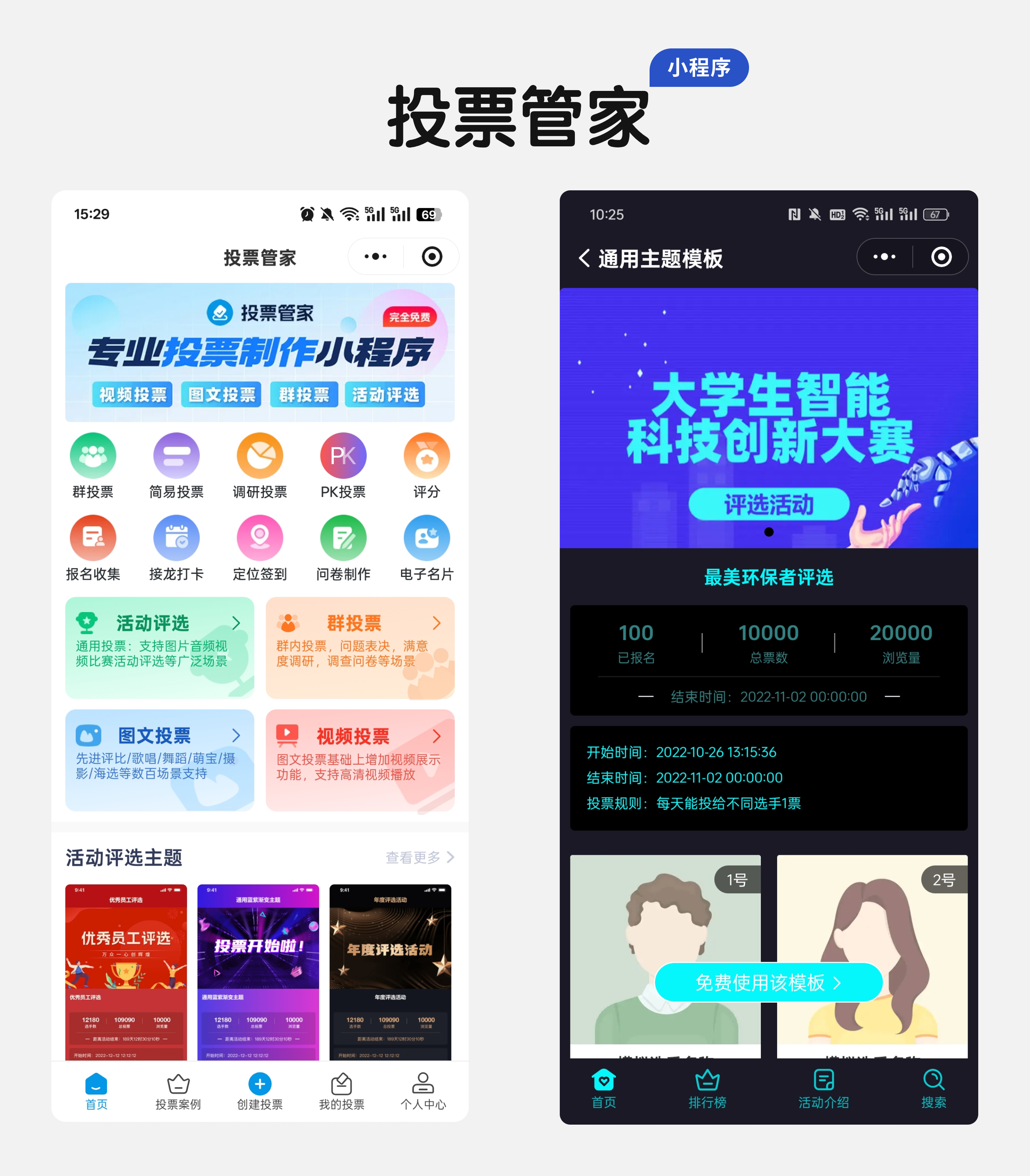 模板颜值高,自带社交属性模板库覆盖短视频大赛、美食评选、萌娃投票、节日评选等,风格清新时尚,还能生成专属选手海报,参赛者一键转发朋友圈,搭配 “分享得额外投票机会”,裂变效果拉满。
